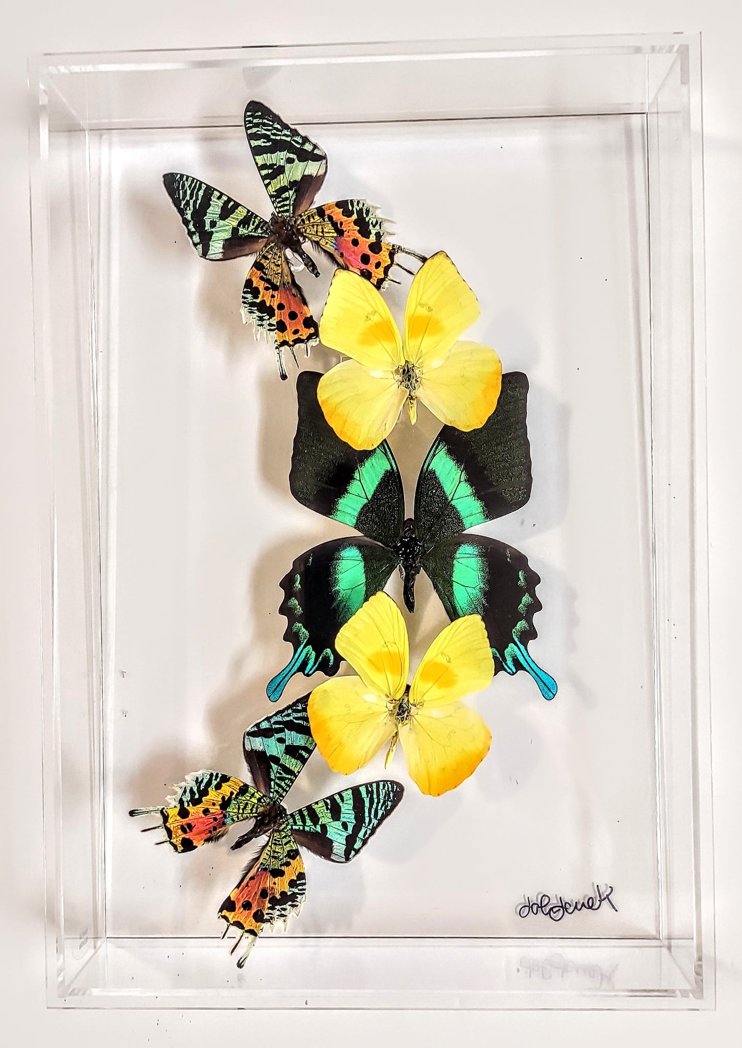 This Beautiful Butterfly Creation showcases real tropical butterflies mounted in a wave pattern in a 8"x12"x2" rectangle acrylic display. The tropical butterflies in this case are very colorful and diverse.